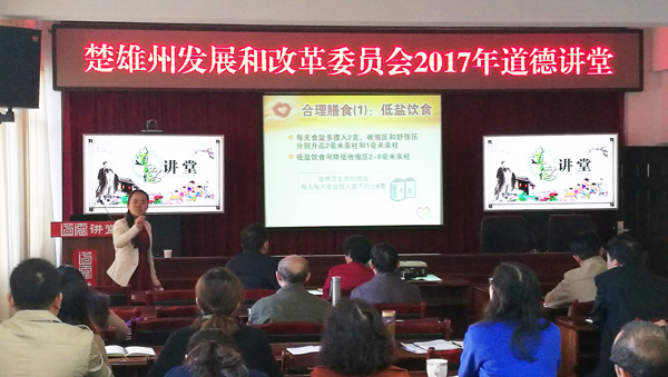 11月17日上午,州发改委2017年道德讲堂开讲:一是全体干部职工唱《公民道德歌》;二是诵经典诸葛亮《诫子书》;三是州医院心血管内科主治医师张丽梅讲授心血管疾病防治相关知识;四是楚雄州警校高级讲师、国家三级心理咨询师陈晓琳讲授心理压力的应对及策略。张医生主要从“三多、三高、三步骤”讲授了高血压预防的相关知识;陈老师主要从正确认识心理压力,积极应对压力的策略等方面进行了讲授。两位老师的讲授内容丰富、生动,具有较强的针对性和可操作性,其中,“压力的时间管理”不但有利于指导我们舒缓压力,而且对于科学统筹各项工作也具有积极的借鉴作用。